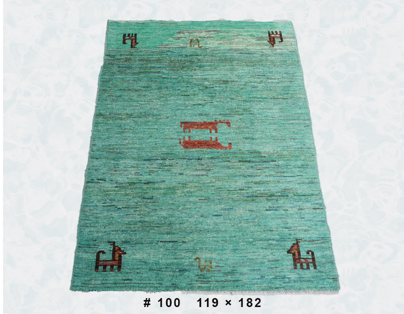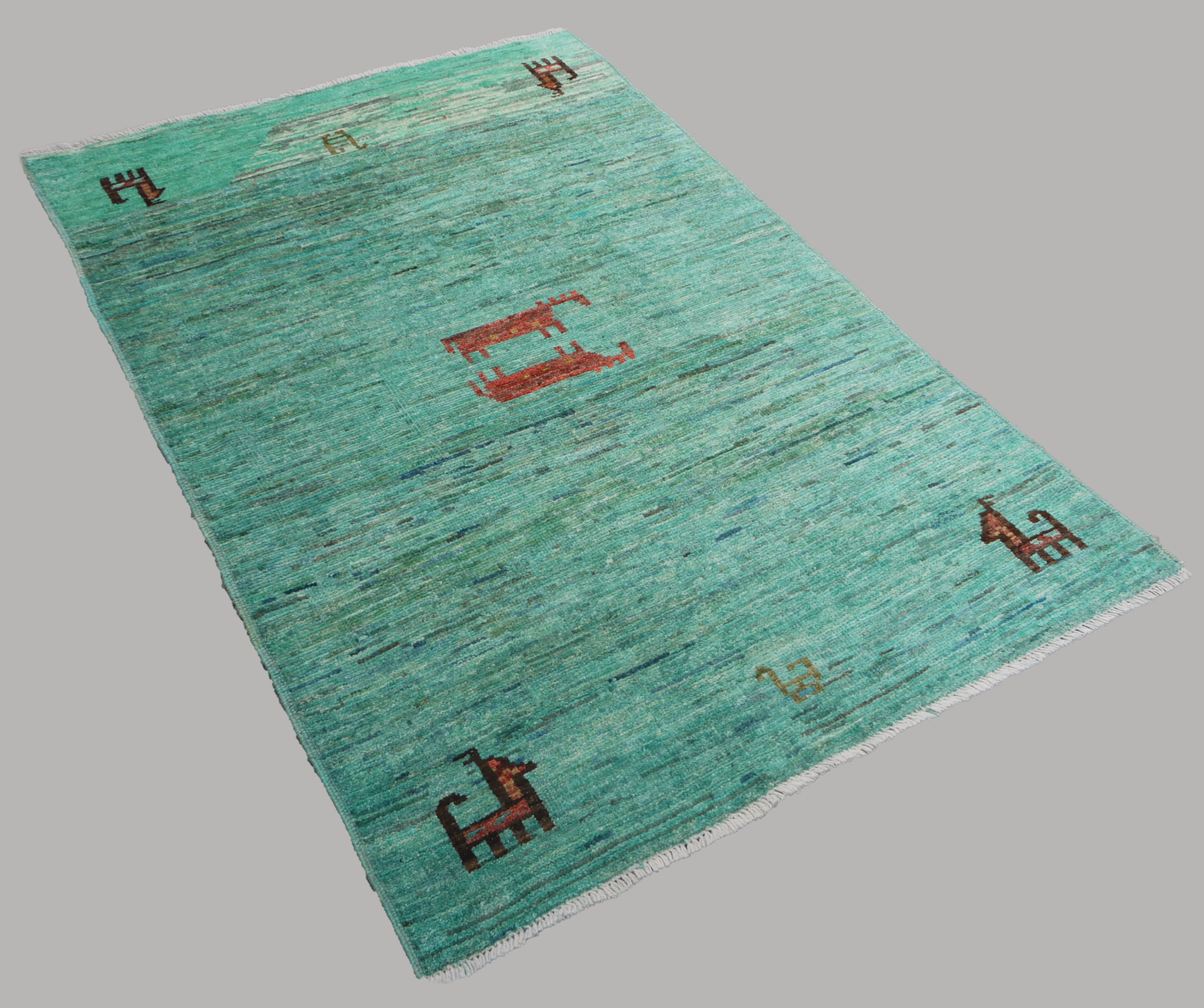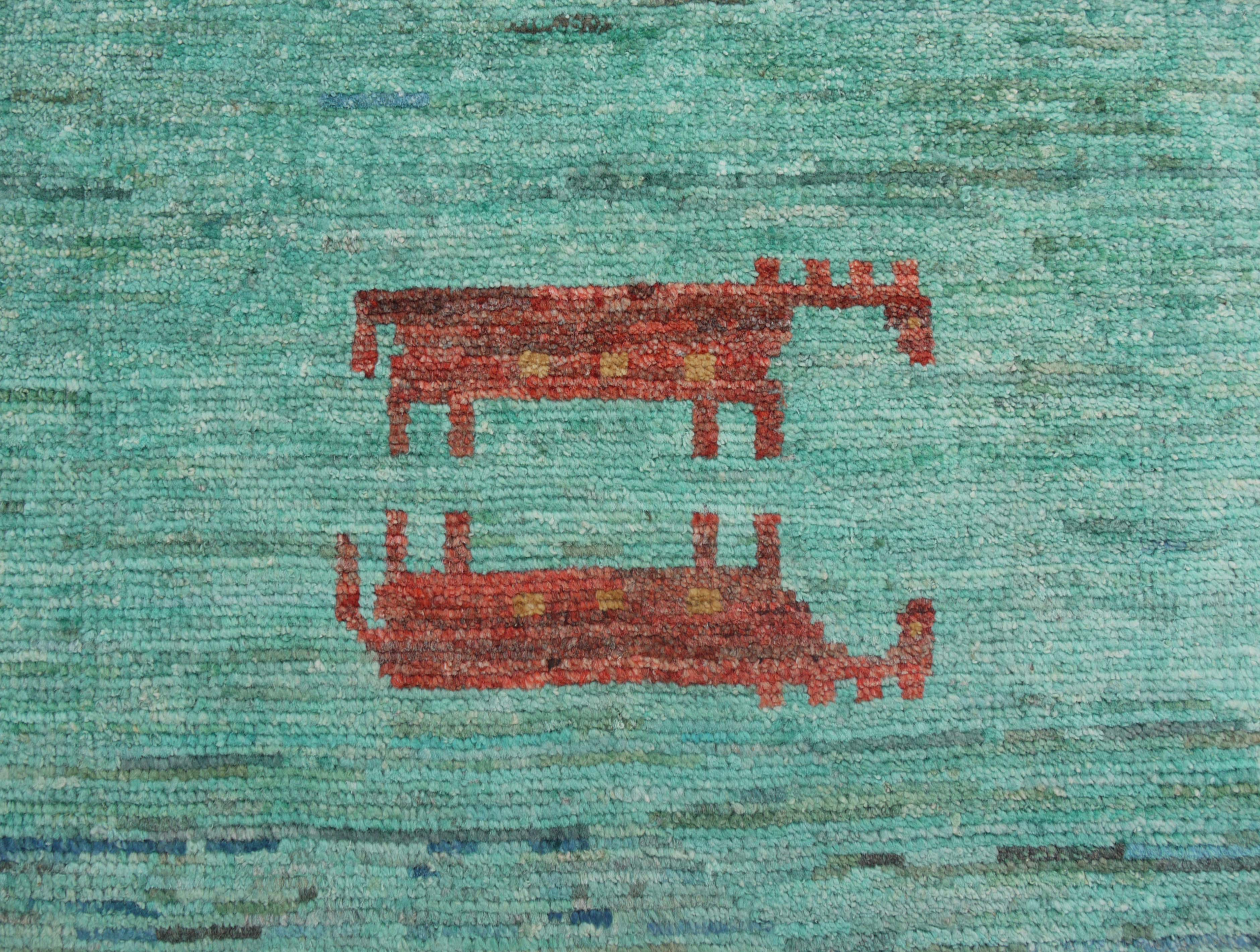 This rug captures the spirit of nomadic Gabbeh tradition: open fields of colour interrupted by symbolic figures that tell quiet stories. Its scale makes it versatile, its palette fresh and vibrant. A handcrafted piece that carries both innocence and sophistication into any space.