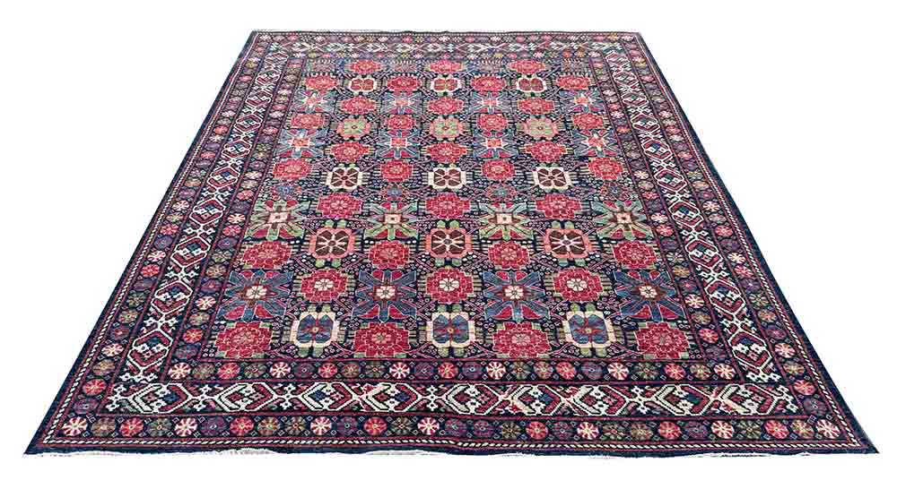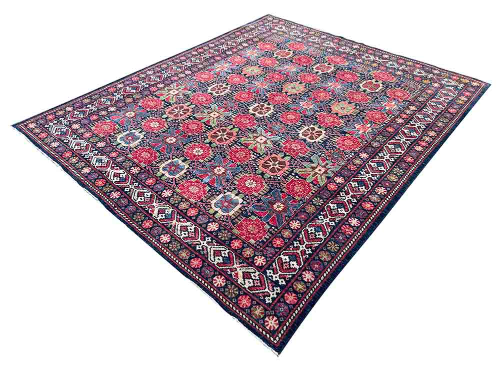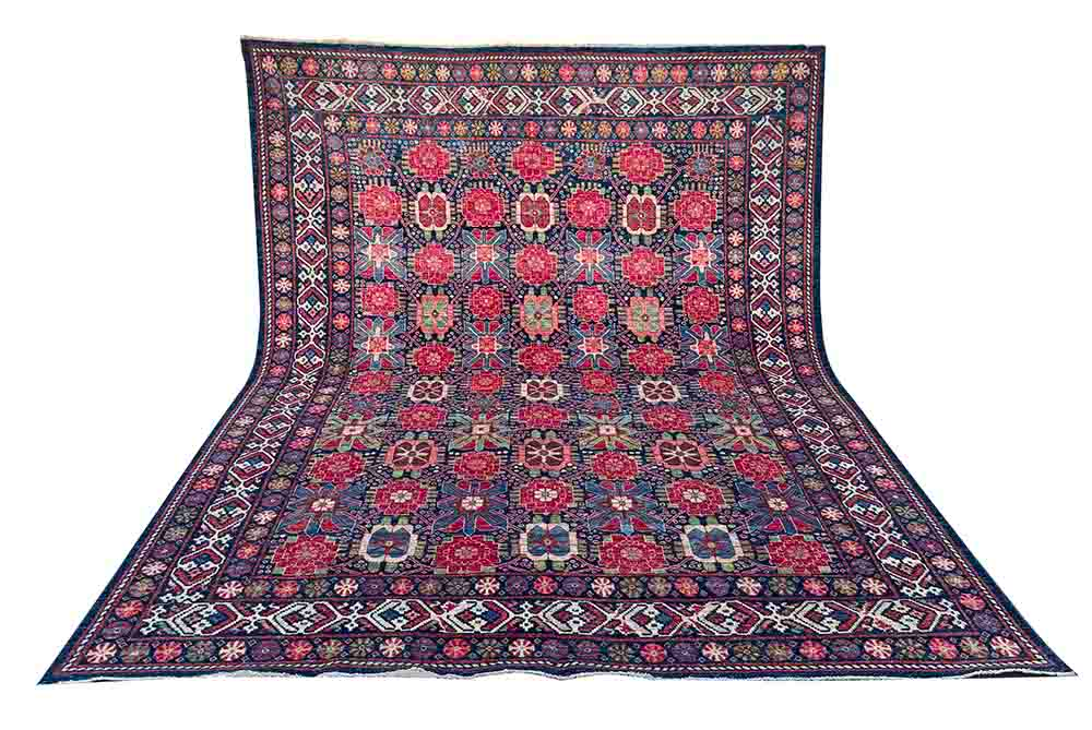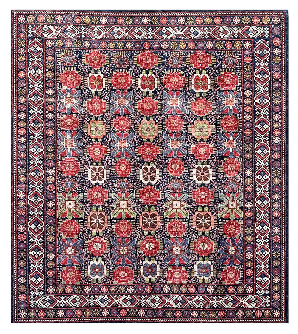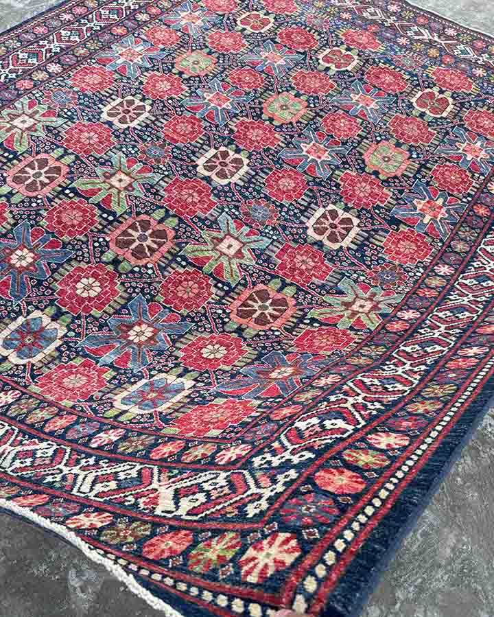 A dazzling grid of rosettes fills this Caucasian rug, each blossom patterned like a miniature mandala. The repetition is joyous, a celebration of symmetry and color, with deep blues and vivid reds entwined in harmony.