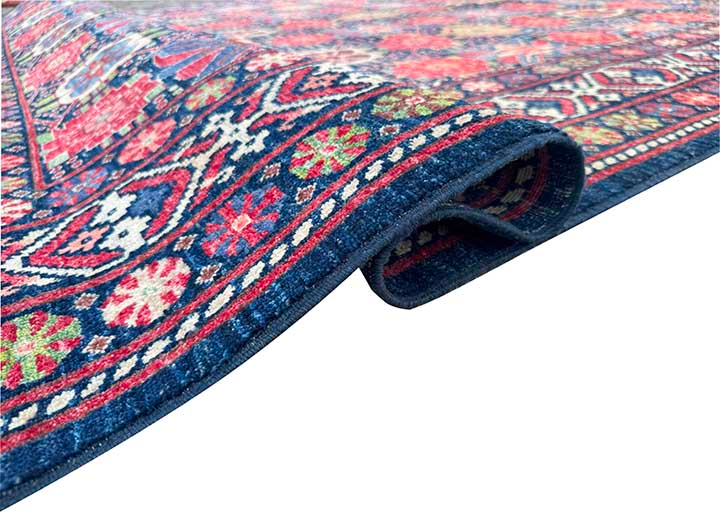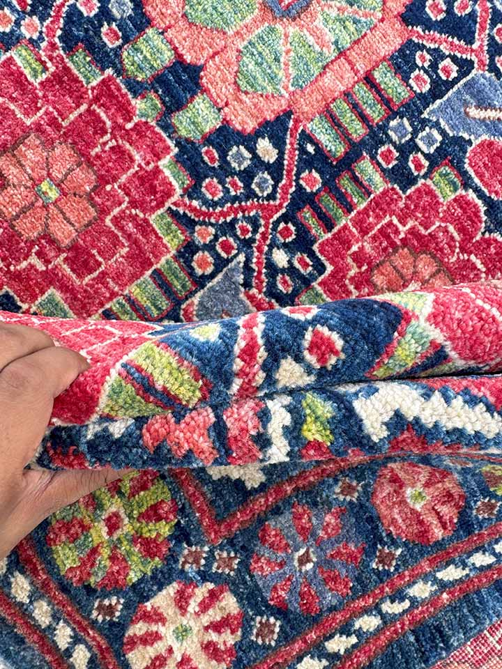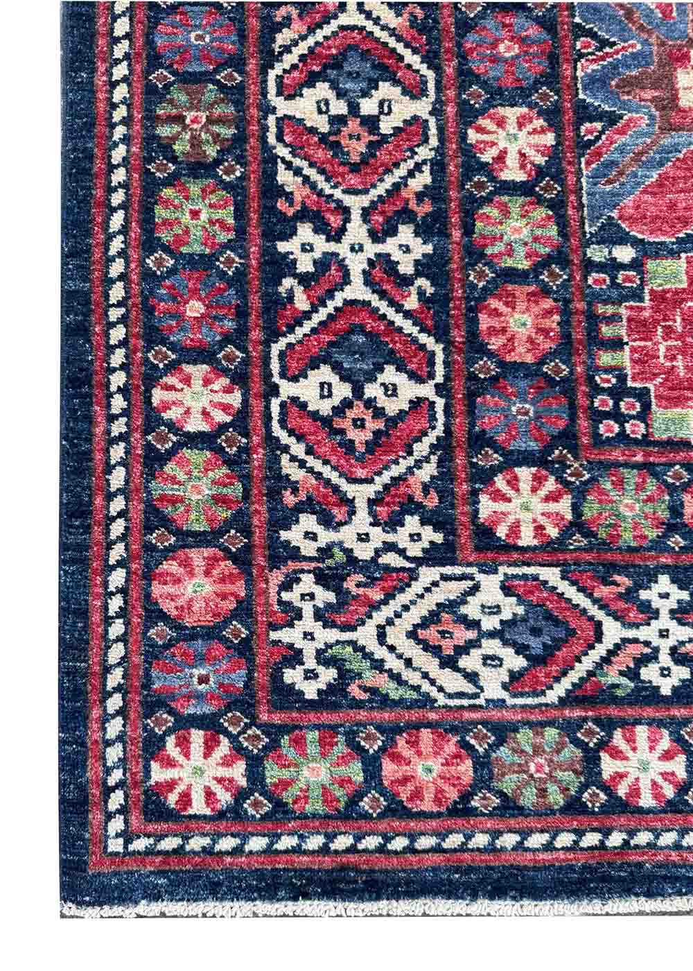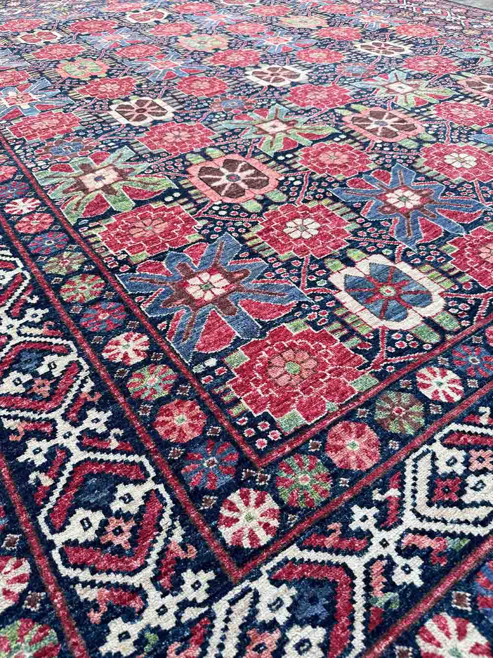 A dazzling grid of rosettes fills this Caucasian rug, each blossom patterned like a miniature mandala. The repetition is joyous, a celebration of symmetry and color, with deep blues and vivid reds entwined in harmony.