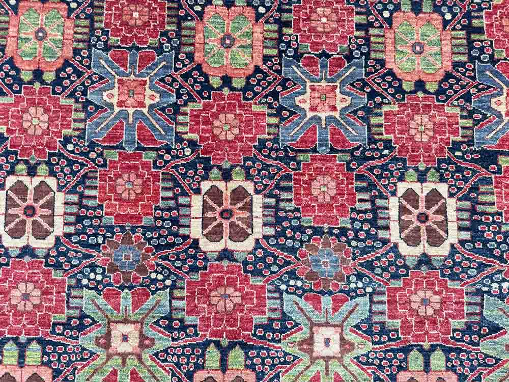 This rug is pure exuberance, a festival of flowers rendered in wool. It enlivens large rooms with pattern and vitality.