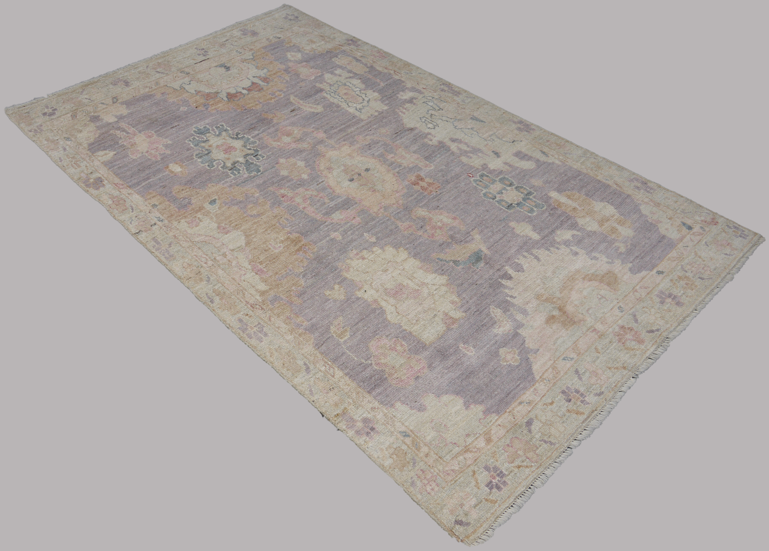 A gentle lavender field hosts drifting floral medallions in ivory, blush, and sage, framed by a pale border with delicate tracery. The handspun wool softens the pastel palette, giving the entire piece a washed, vintage-like patina. Subtle yet richly detailed, it carries a quiet elegance rooted in Afghan weaving tradition.