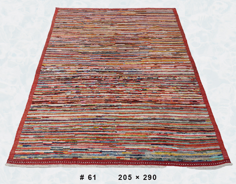 Vibrant bands of crimson, ochre, indigo, and earth sweep across the field, as if painted in bold strokes. The wool pile carries a rich tactile depth, while the Gabba weave intensifies the color’s saturation. It feels alive, tribal energy harnessed into contemporary rhythm.
