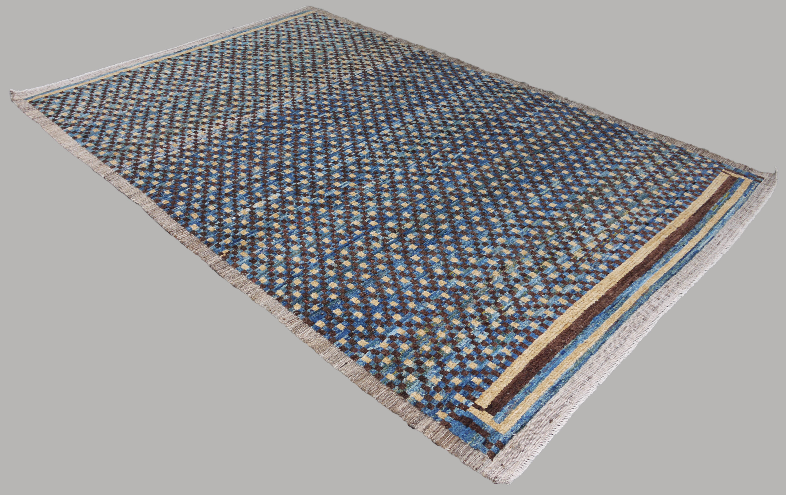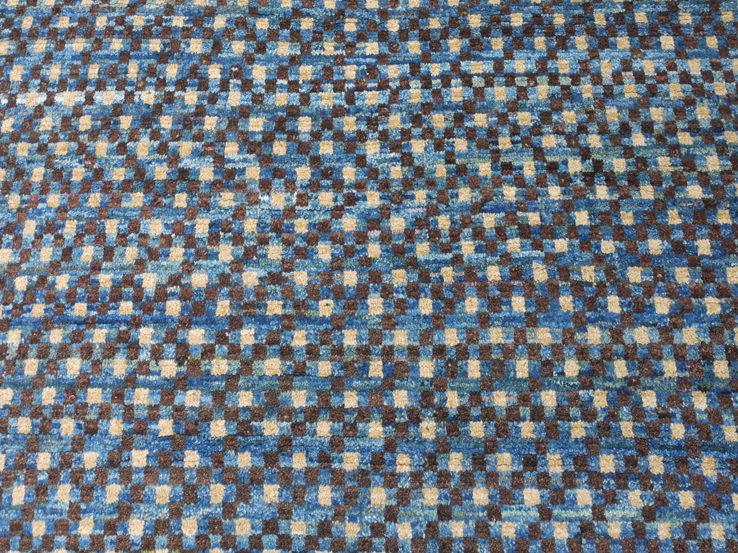 An intricate field of interlocking checks in blue, brown, and ivory forms a dense yet vibrant surface, softened by the natural texture of handspun wool. Along one edge, a horizontal band in earthy browns and sky tones adds a subtle asymmetry, giving the rug a distinctive character.