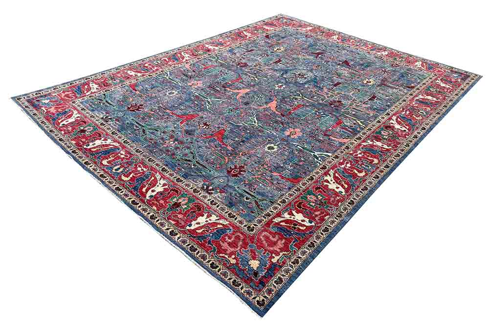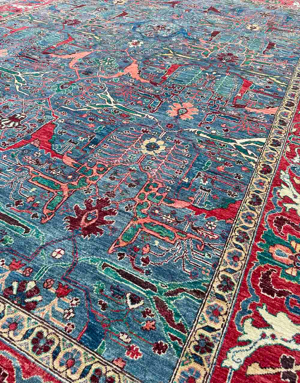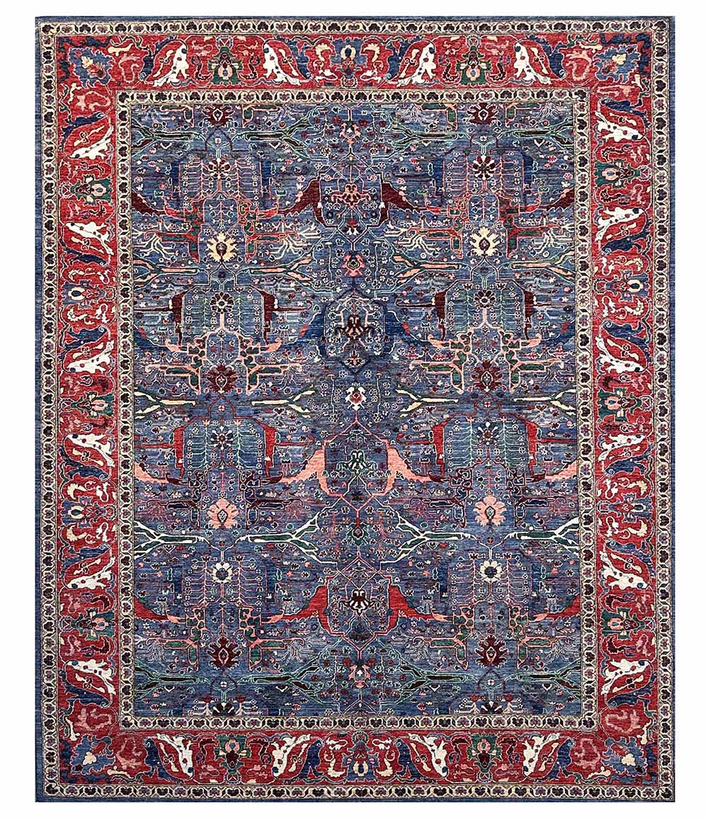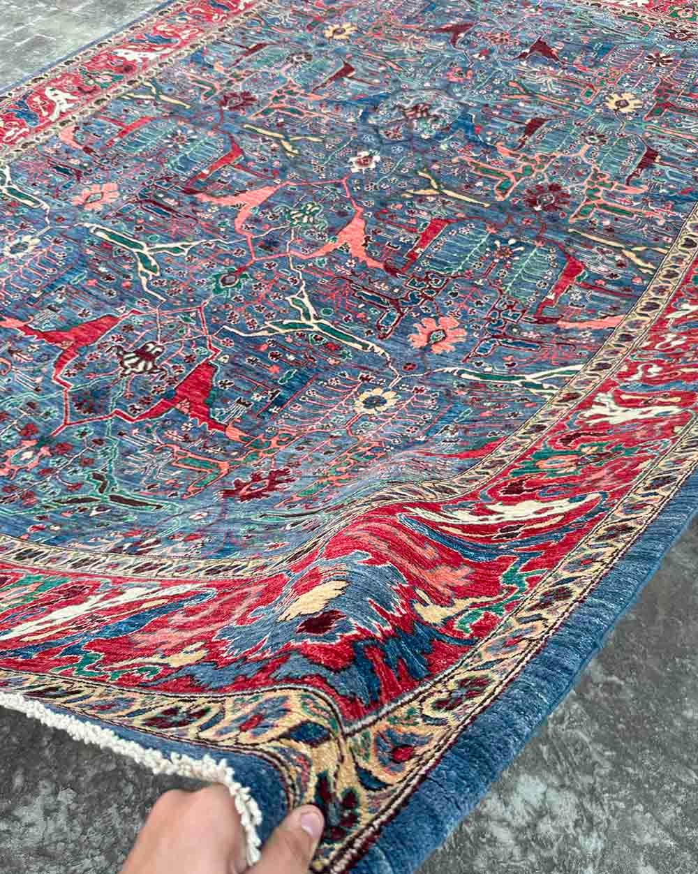 This monumental Bidjar rug is a sea of cobalt and indigo, patterned with lattice-like geometry and bursts of crimson. The heavy weave creates a floor presence that feels unshakable, while the red border brims with stylized animal and floral motifs, like guardians surrounding the oceanic field. Its balance of intricacy and weight embodies the legendary durability of Bidjar craftsmanship.
